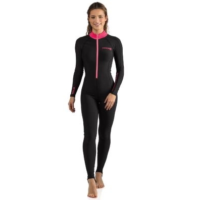 Skin Lady, %86 Polyester ve %14 Spandex materyal kullanılarak ince bir kumaştan üretilmiş, çok yönlü ve seyahat eden dalgıçlar için olmazsa olmaz bir tulumdur.